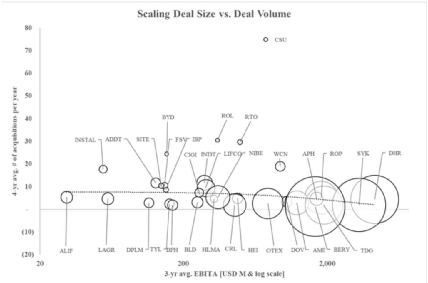 The dilemma CSI faces is that it cannot keep acquiring small companies, or else it would need to acquire 300 a year in no time to maintain the ROCE. However, if it increases the deal size, it needs to lower the hurdle rate, which will decrease the IRR.\