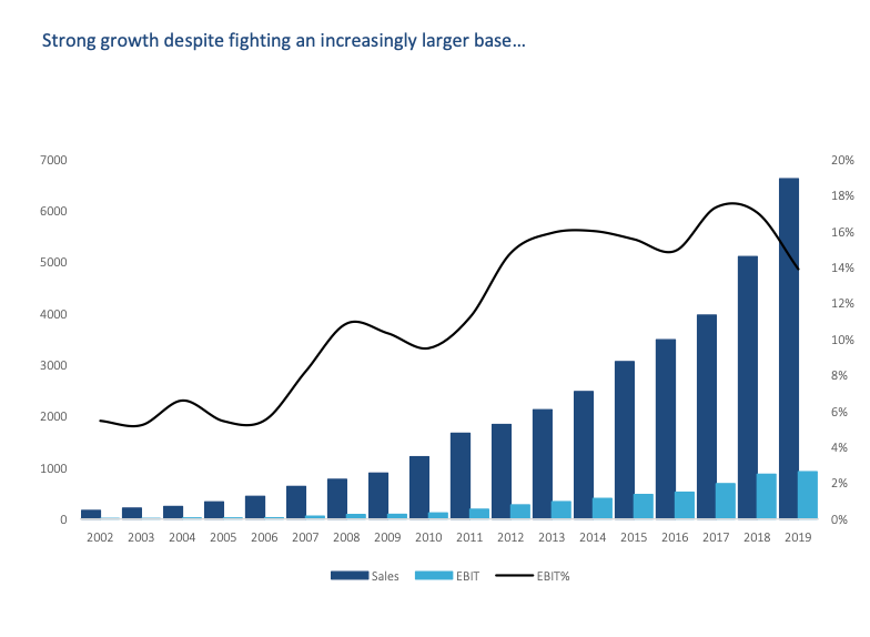 Revenue is roughly $6.5 billion, which has compounded at 24% since the IPO and 22% over the past 10 years.