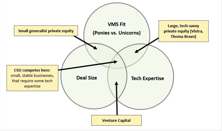 In some sense, constellation has found itself a whitespace where the companies it targets are too small for PE and VCs, and because of its reputation the companies are much more likely to chose CSI over a small equity firm - all of this makes them a preferred choice for the kind of companies that CSI likes to target.